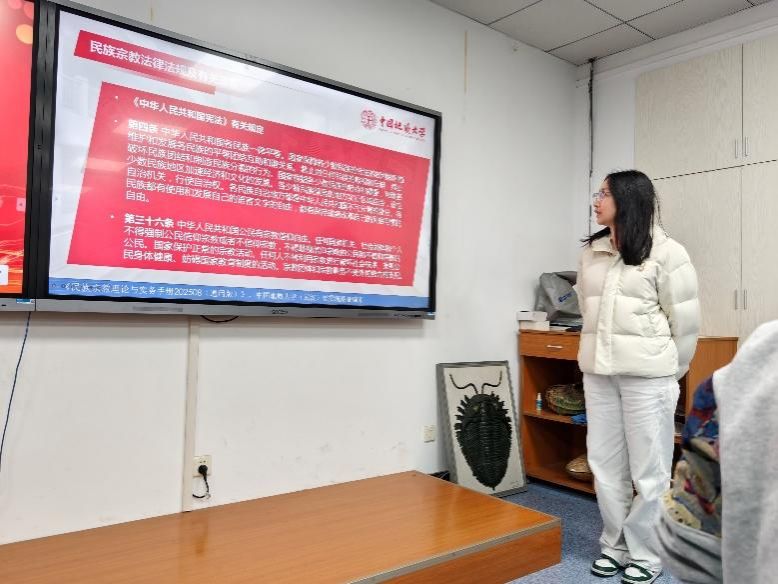 金钉子党支部徐华阳同志领学民族宗教相关政策法规及《民族宗教理论与实务手册》。她结合当前民族宗教工作面临的新形势新问题及相关法律法规条文,引导大家深刻认识民族宗教工作在党和国家工作全局中的重要地位,并重点围绕“为什么共产党员、共青团员不能信仰宗教”这一问题进行了深入阐释。